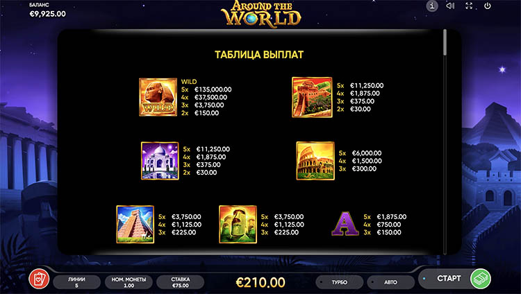 | Сфинкс (Wild) | 150 | 3750 | 37 500 | 135 000 |