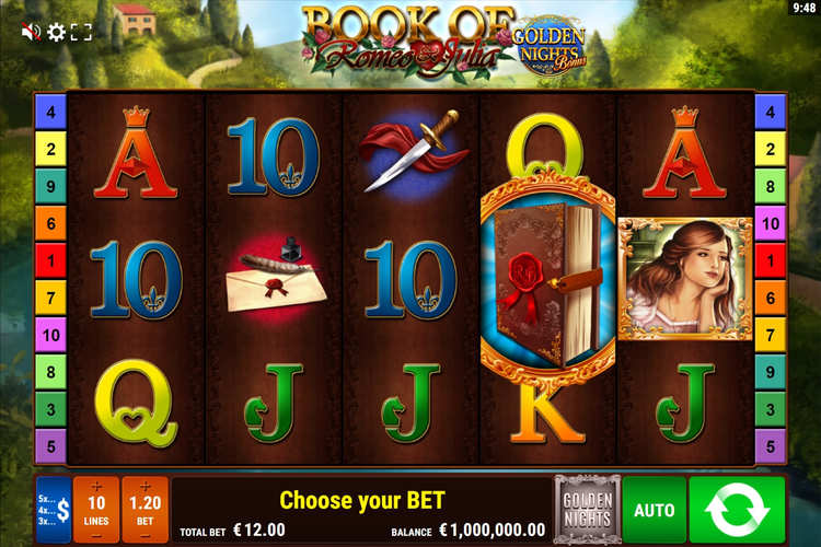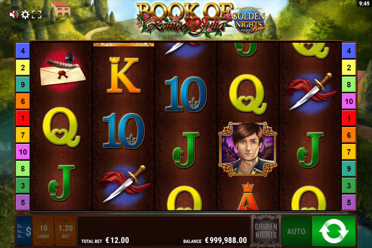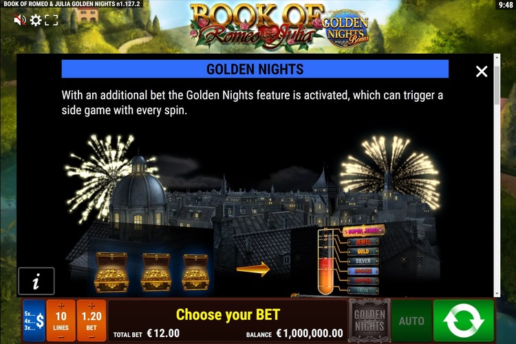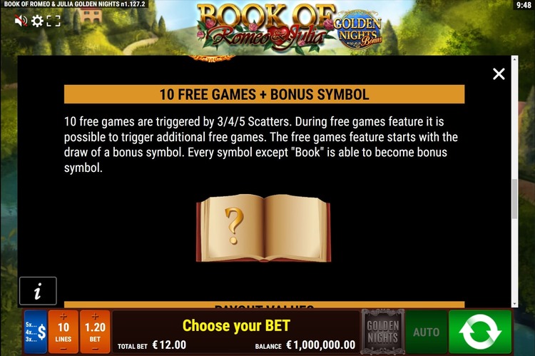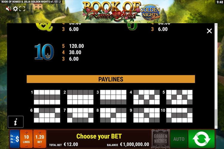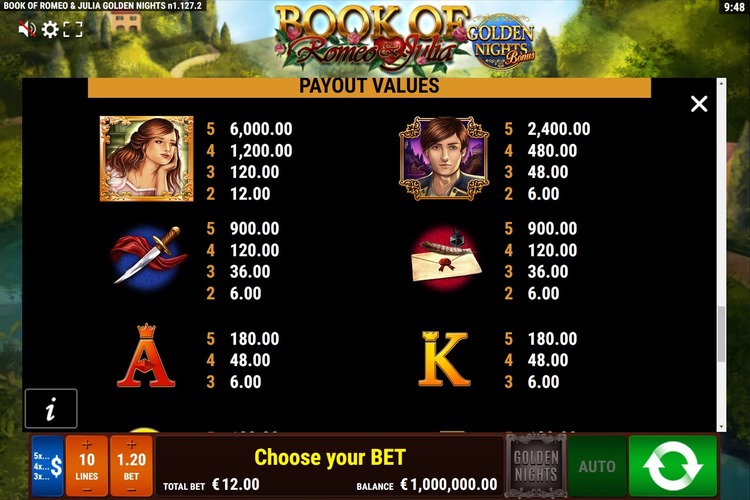 Таблица выплат Book of Romeo and Julia Golden Nights