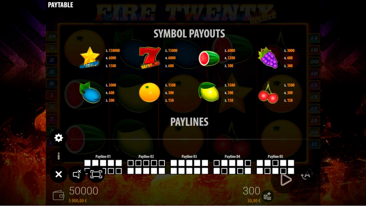 Таблица выплат Fire Twenty