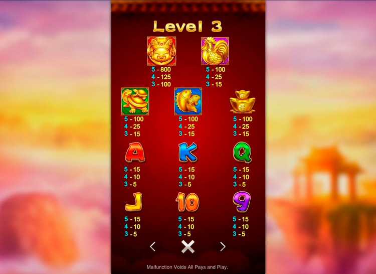 | Золотые слитки, Рыбы, Черепахи, Петух | 15 | 25 | 100 |