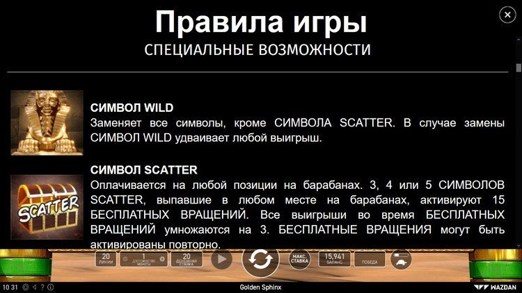 | Золотой Сфинкс (Wild) | 10 | 250 | 2000 | 10 000 |