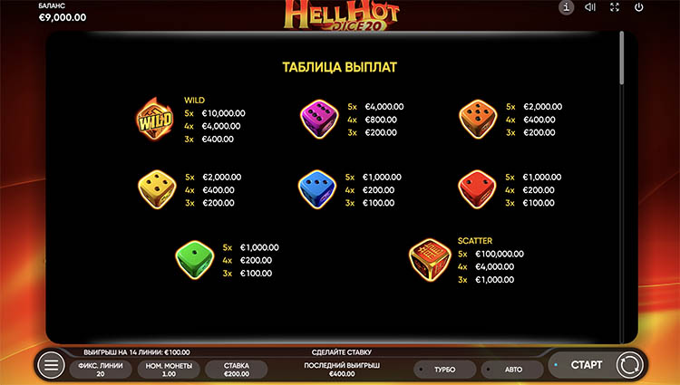 Таблица выплат Hell Hot Dice 20