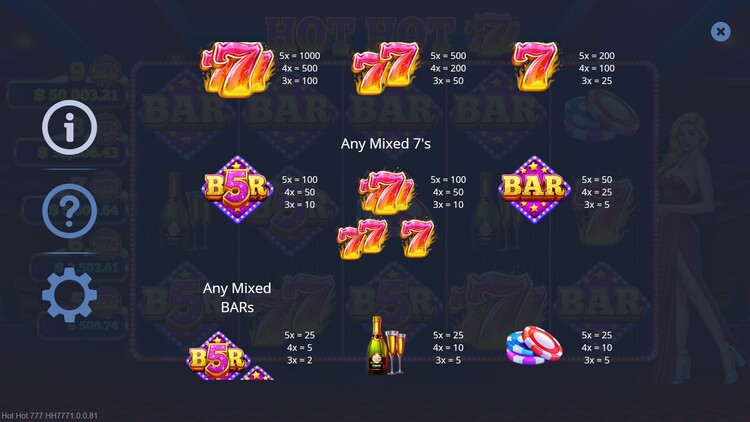 | Любая Семерка, Бар с пятеркой | 10 | 50 | 100 |
