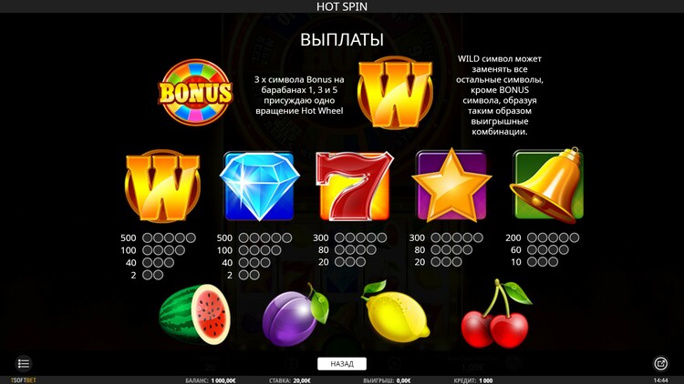 | Буква W (Wild) | 2 | 40 | 100 | 500 |