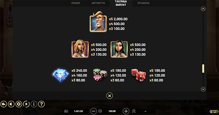 Таблица выплат Mr. Vegas 2: Big Money Tower
