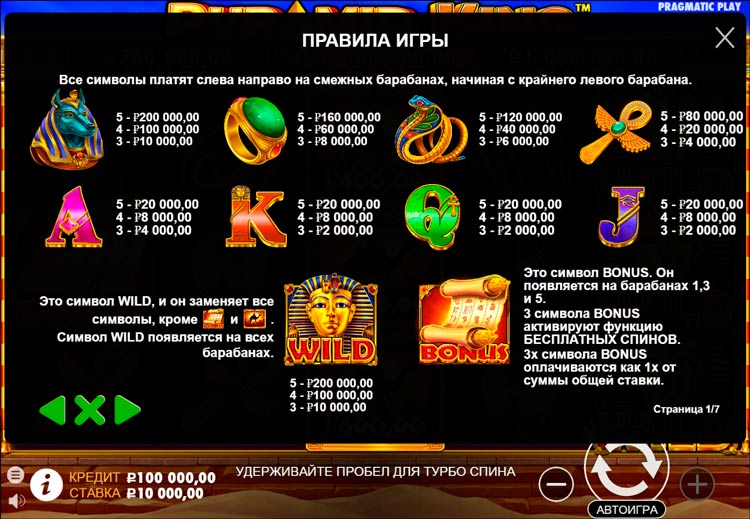 | Анубис, Маска фараона (Wild) | 10 000 | 100 000 | 200 000 |