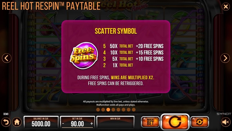 | Free Spins (Scatter) | 90 | 450 | 900 | 4 500 |