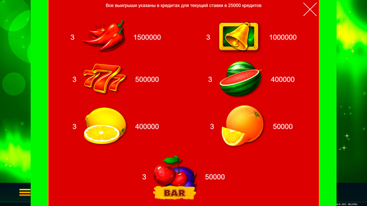 | Bar, вишни, сливы, апельсин | 50 000 |
