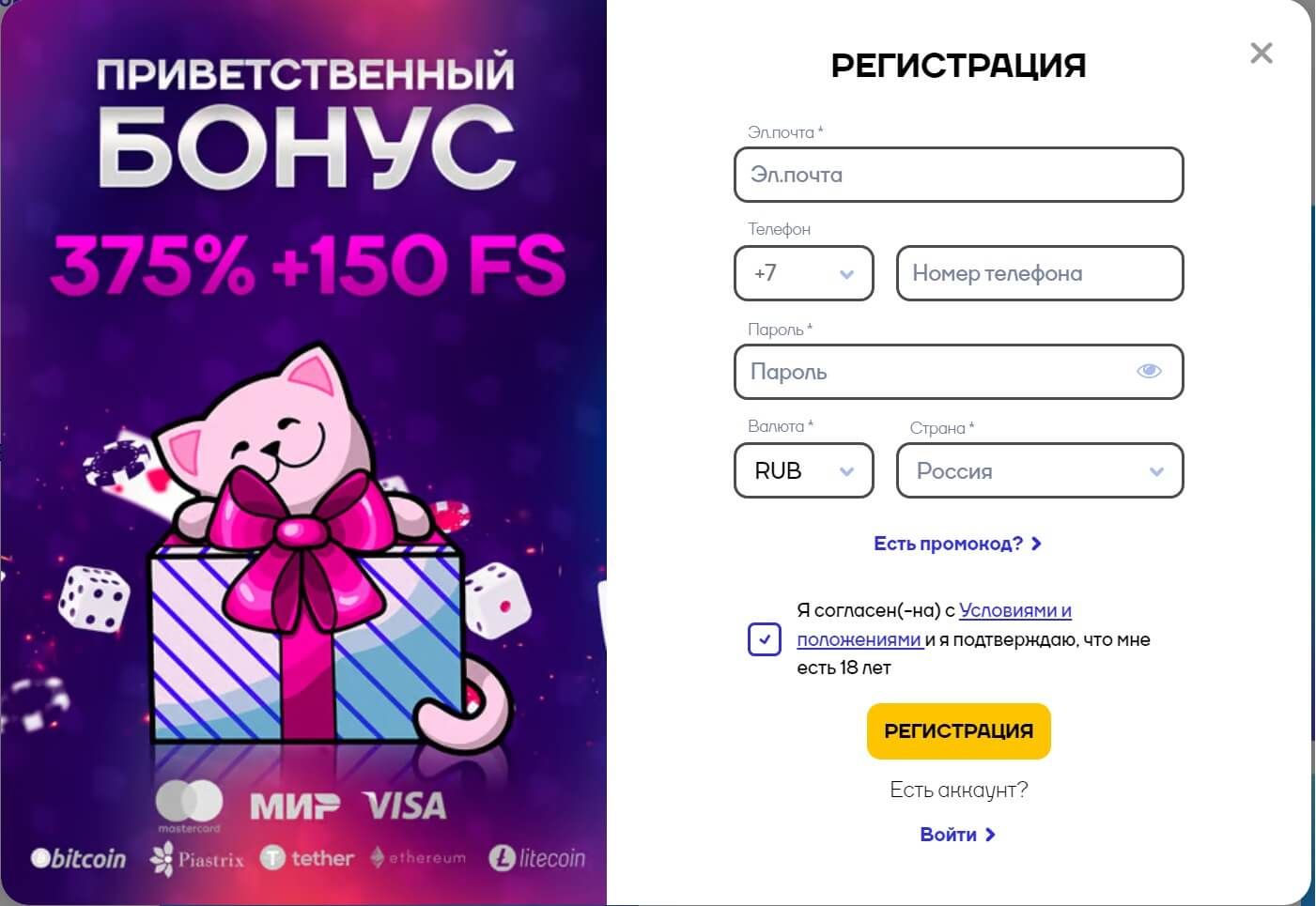 Чтобы зарегистрироваться на сайте Cat Casino, необходимо заполнить лаконичную, но в то же время подробную форму. Цель этой формы - собрать все данные, необходимые для создания вашей учетной записи и обеспечения беспрепятственного и приятного игрового опыта. Прежде всего, необходимо определить, хотите ли вы воспользоваться вступительным предложением.