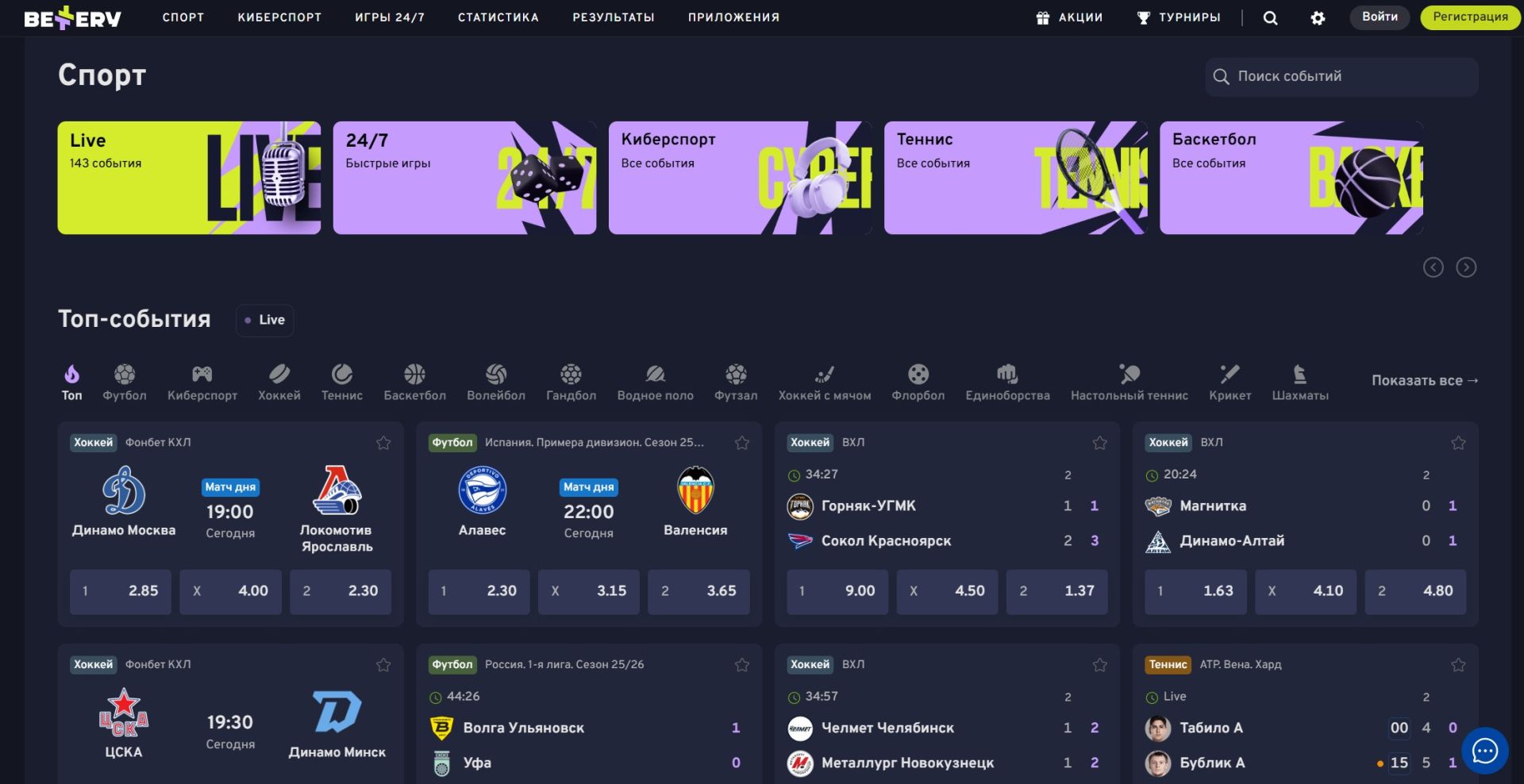 Доступны популярные направления: футбол, хоккей, теннис, баскетбол, волейбол, бокс, киберспорт и даже настольный теннис.