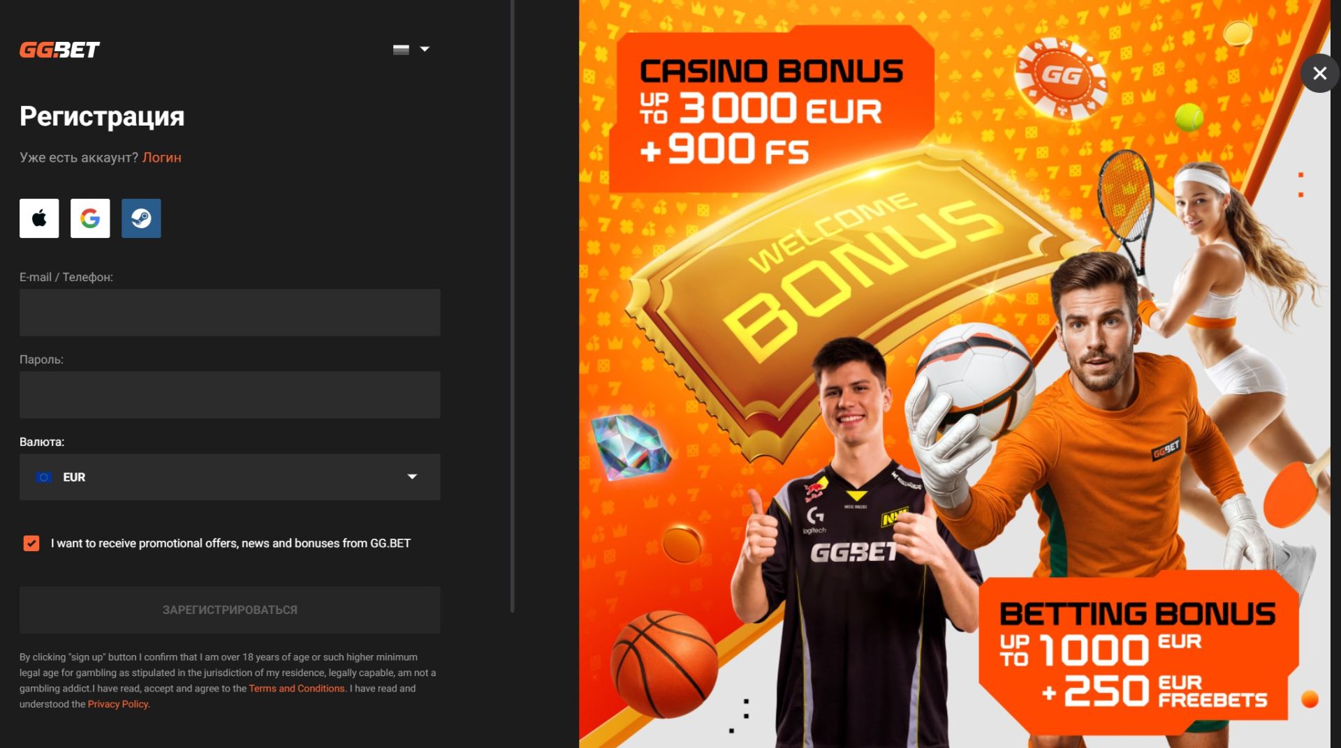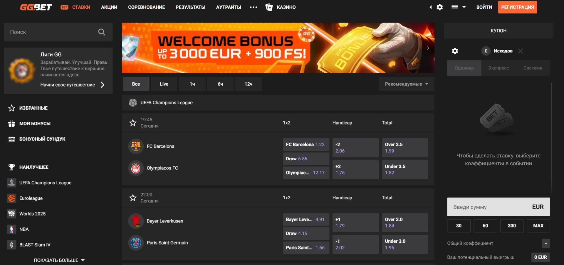 Сайт GGBet отличается современным и лаконичным дизайном, выполненным в тёмных тонах. Главные разделы — «Спорт», «Киберспорт», «Казино» и «Акции» — расположены интуитивно, а регистрация занимает не более минуты.