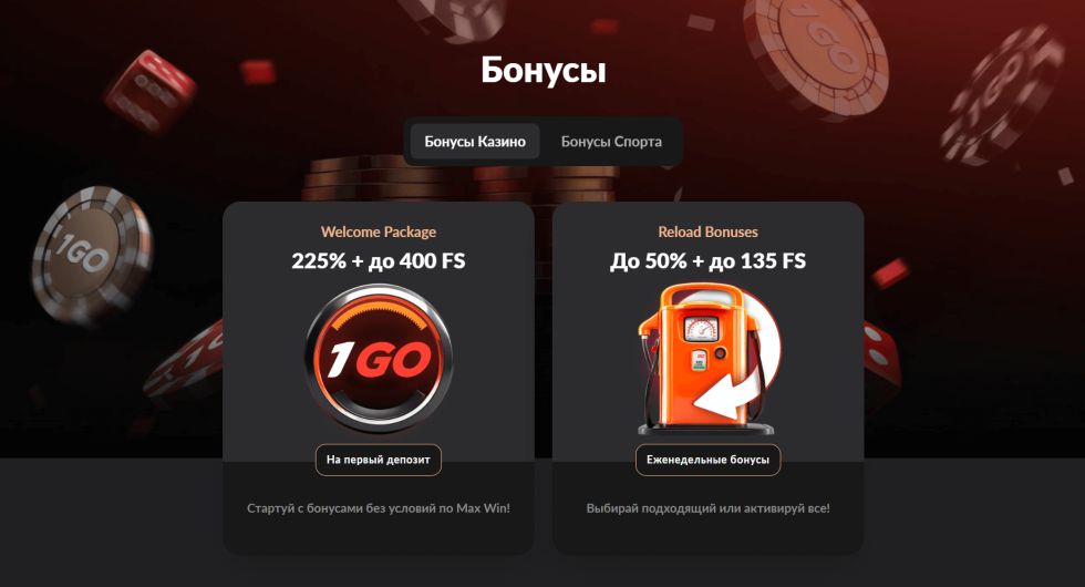 Онлайн-казино 1GO предлагает множество бонусов и акций, которые делают игровой опыт еще более захватывающим и выгодным. От приветственных пакетов до регулярных релоадов, каждый игрок найдет что-то для себя. Подробнее ознакомимся с текущими предложениями и специальными акциями, доступными в казино 1GO.